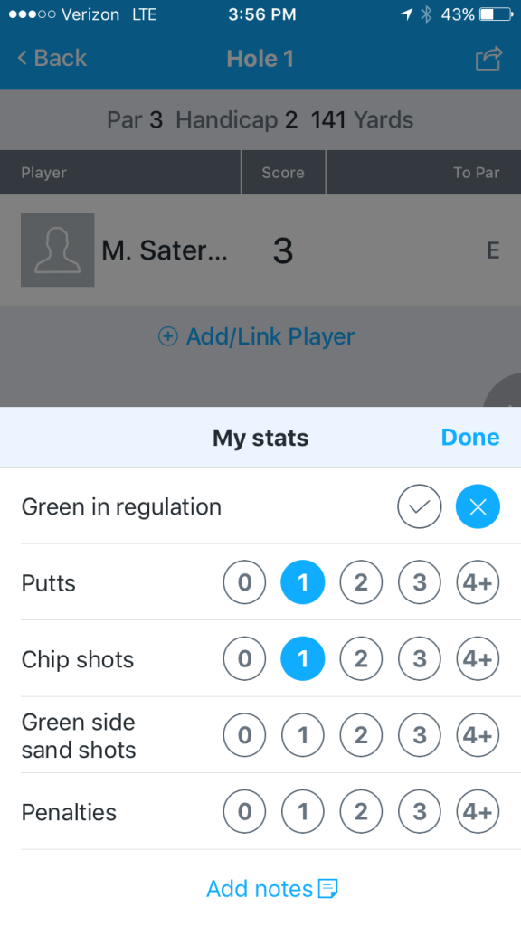 Scoring on 18Birdies is easy. From the GPS screen, you can post your score in three taps. 18Birdies also gives you the ability to track your stats: fairways hit, greens in reg, putts, chips, bunker shots, and penalties. You can also add notes to each hole.