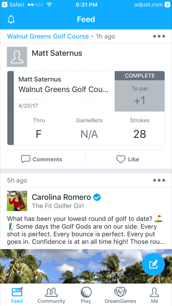 One of the added benefits of the 18Birdies is the layered social network. The app opens to your “Feed” just like Twitter or Facebook – a timeline of posts from 18Birdies users.