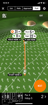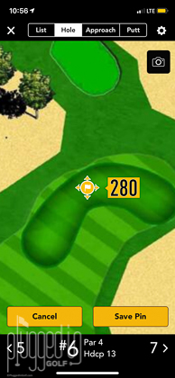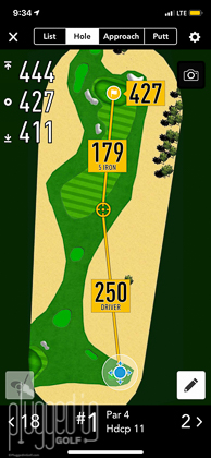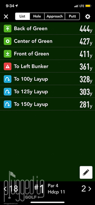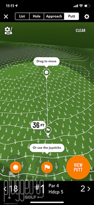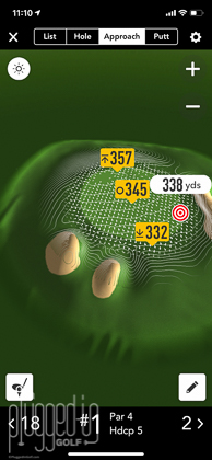 On each hole, GolfLogix provides up to four different distance displays. You can see a list of distances, a bird’s eye view of the hole with a movable target, Approach View, and Putt Break. One nice feature of the hole overview is that as you move your target, GolfLogix indicates what clubs you’ll need to get to that target and from the target to the green.