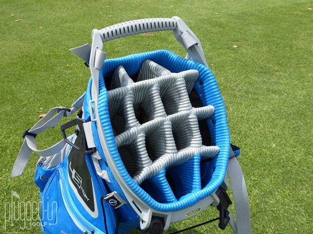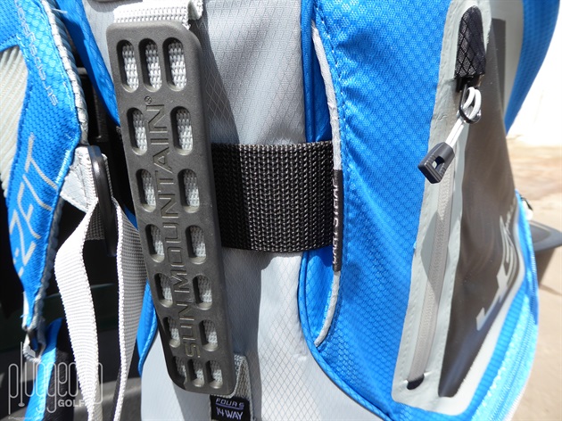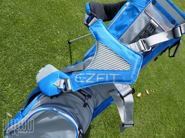 The Sun Mountain 4.5 LS 14-Way has 9 pockets, including my favorite, the velour lined, water resistant black triangle near the top.  Not only does it keep my phone and cash dry, but with the cart strap pass through, it’s always quickly accessible.  The E-Z Fit Dual Strap System is true to its name and features super comfortable padding.  And of course the individual, full length dividers make this bag a popular choice when evaluating carry bags.