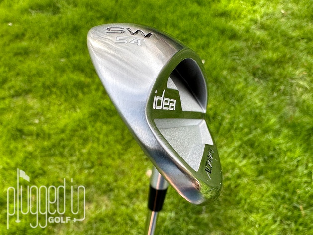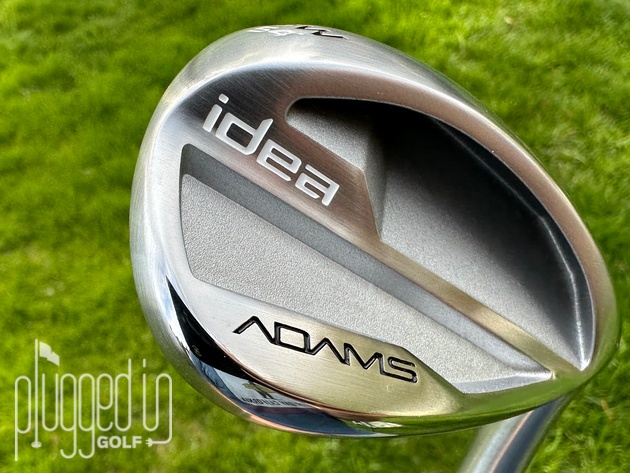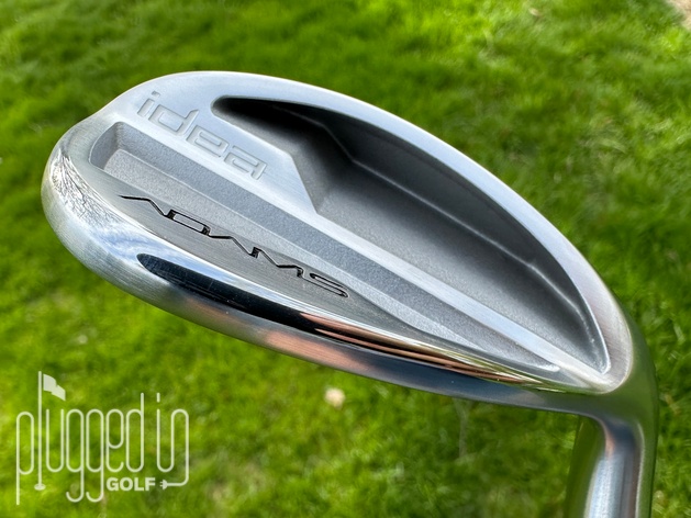 In the bag, this wedge displays a very large cavity near the sole. There’s also a second, separate, shallower cavity across the top of the blade. “Adams” and “IDEA” branding are tucked into two small spots that are not hollowed out.