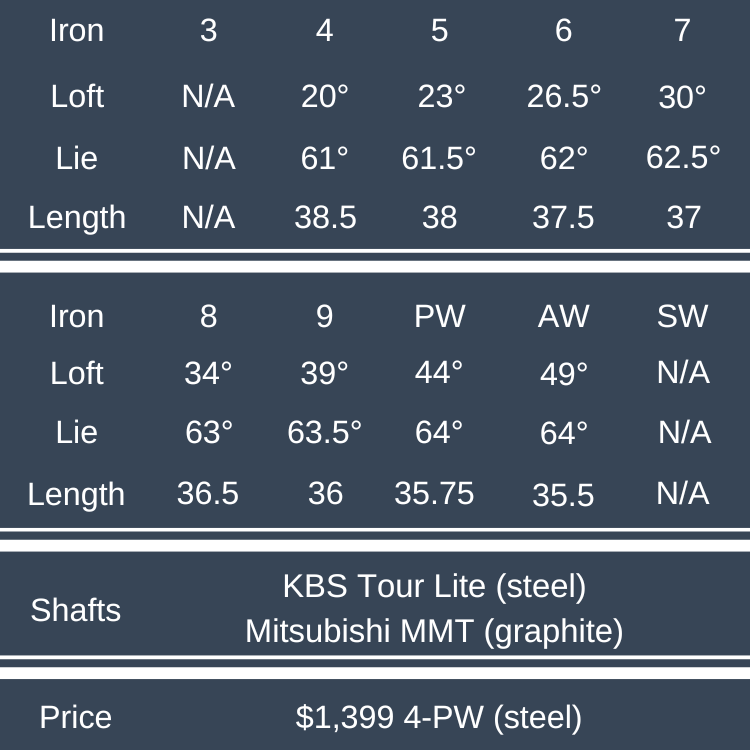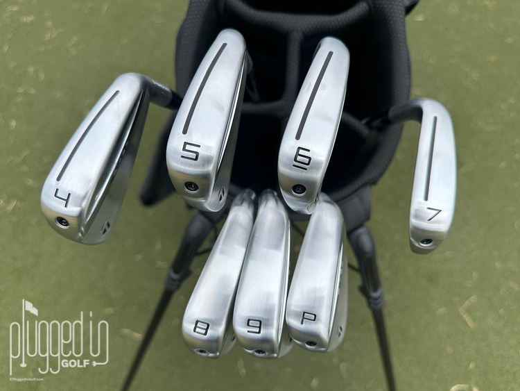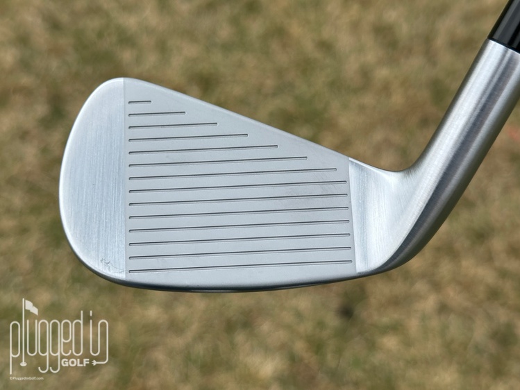 Striking a tour caliber golf ball, I noted a soft feel in the hands with a gentle, crisp “click.” Off center strikes feel firmer, and the sound gets a slightly harder edge. This difference is a little more pronounced in the longer irons due to the faster speed and more violent collision. Overall, these irons provide solid feedback, distinguishing misses from pure strikes and communicating the exact location of the strike through the hands.