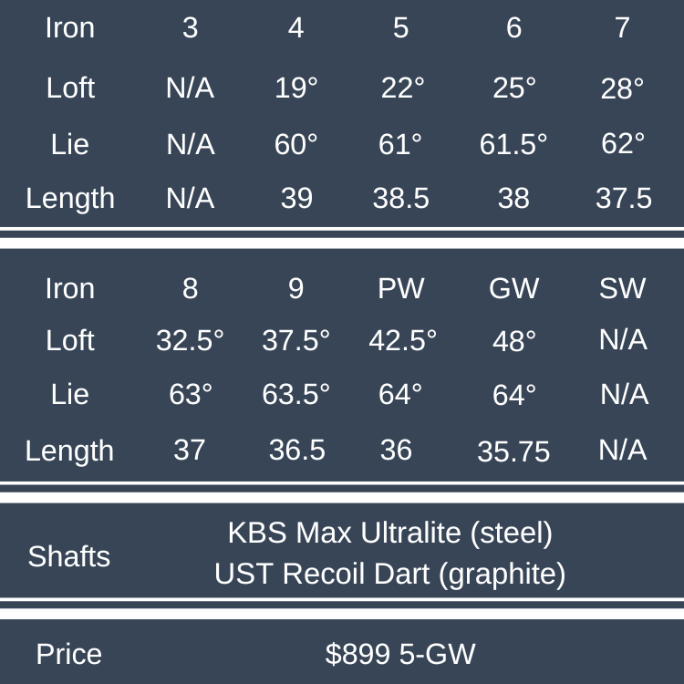 Similarly, the impact sound is quieter than expected. This set does get louder as the irons get longer, but they never step beyond average in volume. The scoring clubs produce a duller, more “thud”-like sound where the longer irons are crisper with a bit of snap.
