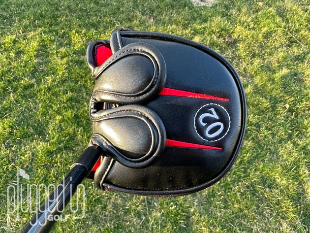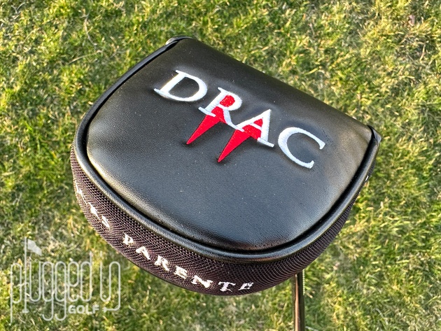 I also like the Drac’s head cover. It carries on the black and red theme, and the dripping red fangs in the R and A are fitting. My one complaint is that the magnetic closure does not navigate the hosel easily. I needed to pull the putter against the heel side of the cover to get a secure grip from both magnets.