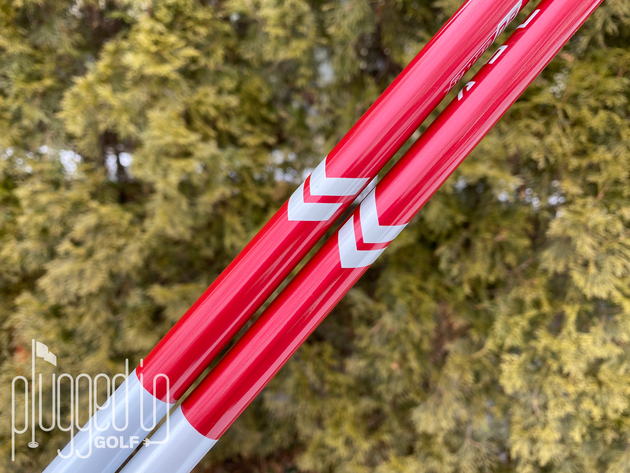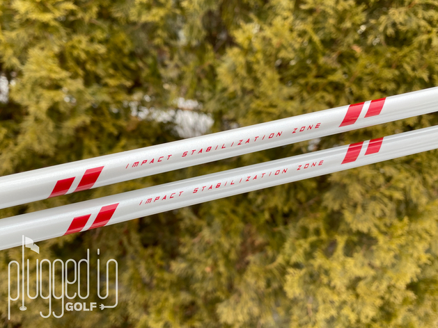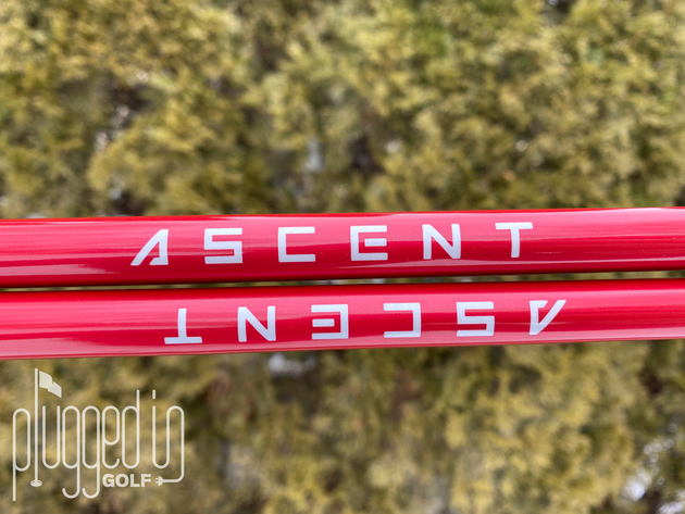 The “Dynamic Deep Red Metallic Flake” color of the Aldila Ascent looks fantastic. The upper two-thirds of the shaft is red with white graphics and that flips in the lower third. With an emphasis on the bold color, graphics are kept fairly minimal. There are some small geometric designs and “Ascent” branding in a futuristic font. Near the tip, “Impact Stabilization Zone” technology is highlighted.