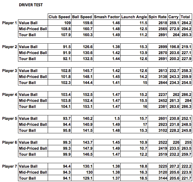 For this test we brought together 7 golfers with handicaps ranging from 0 to 17. Each golfer used their own driver and sand wedge to hit five good shots with a value-priced ball, a mid-market ball, and a tour ball from the same manufacturer. All data was recorded by Trackman.