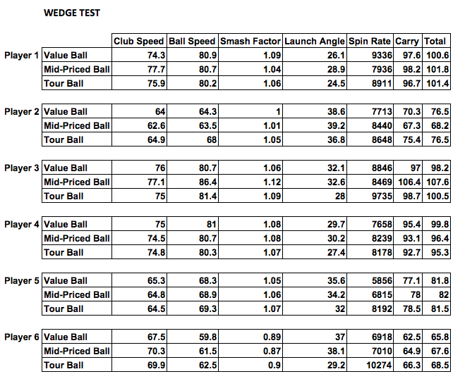 An interesting facet of this data is how the spin gap relates to distance. The three players who hit their wedge shots the farthest were the ones who spun the non-tour balls more. The player with the largest gap in spin between balls hit his wedge shots the shortest distance. This leads us to wonder if the advantage of a tour ball is not seen in full shots but in partial shots and pitches.