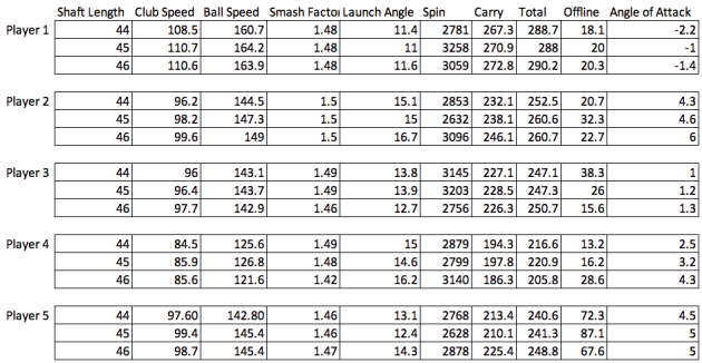 An interesting piece of information that is missing is the height of the players. I would almost venture a guess that player #3 was taller if the 44″ shaft was not more accurate for them. It would be helpful to know more about the players physical makeup. If I did this study, they would all be very similar for round #1. Then for round $2, I would change their height, then move to male/female, physical strength.