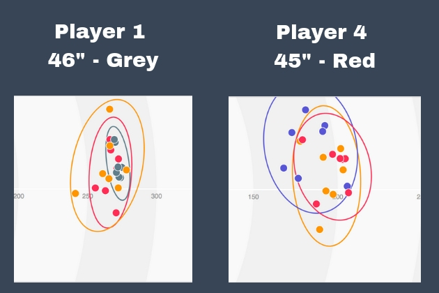 There were two players who had one length substantially outperform the others for distance consistency – Players 1 and 4. Player 4 was best with 44″, but Player 1 was best with 46″. Our other testers were a mixed bag, but the differences between lengths were not substantial.