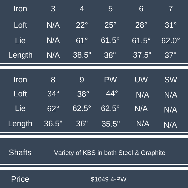 Spin was a bit on the low side, but with typical game improvement lofts the irons strike a nice balance between distance and playability. To find the right balance for you, Argolf offers an impressive array of KBS shafts – plus those PGA professionals available to help you with the optimal fit.