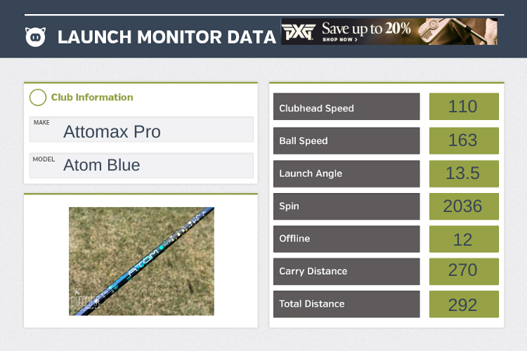 With this kind of stability, I would not predict excellent ball speed, but the Attomax Pro Atom has that, too. After establishing a baseline with a gamer shaft, I switched to the Atom Blue and saw my ball speed jump to the top of my range. To be clear, it’s not faster than other well-fit shafts, but it’s right at the top for ball speed for my swing.