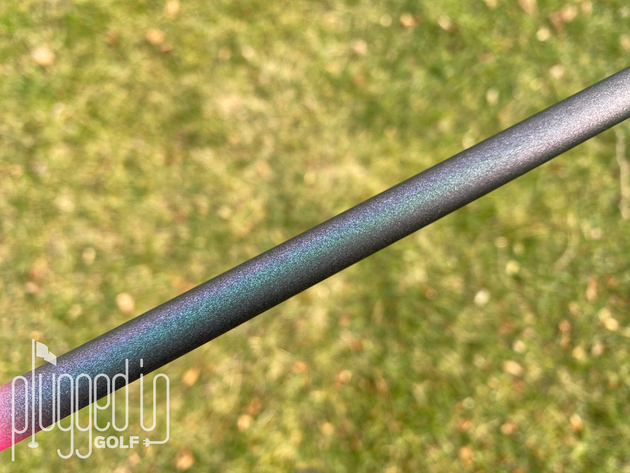 The Autoflex shaft comes in two bold color choices: pink and rainbow. As you can see, I tested the pink version, which has strong Bubba Watson vibes. The middle is a bright, bubble gum pink with “autoFlex” branding wrapped around in black, gold, and silver. Both the tip and butt sections look black, but they have a subtle iridescence which is very cool.