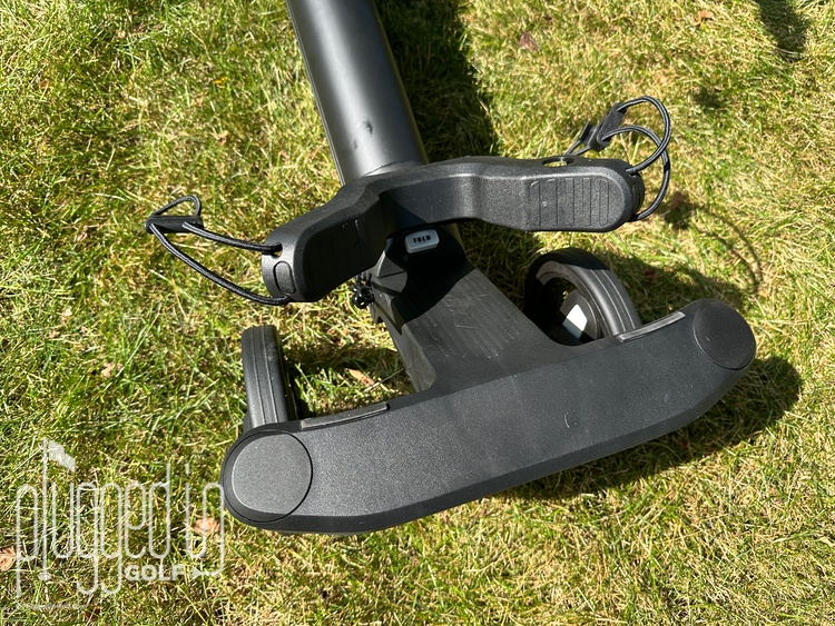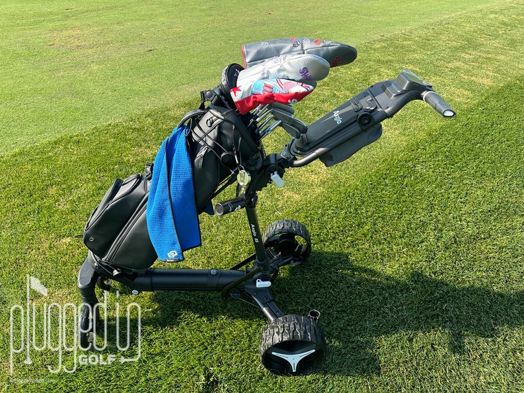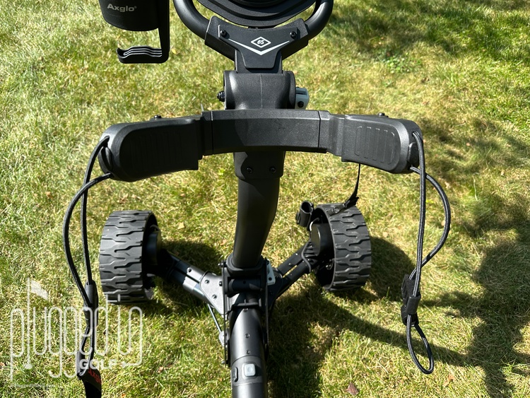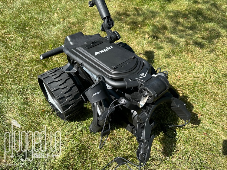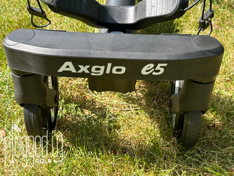 Before moving on, I’ll note the dimensions of the Axglo e5 electric push cart. Folded, it’s 25″ X 16.5″ X 15″. This is one of the more compact electric push carts I’ve tested. With the battery, it weighs about 35 pounds.