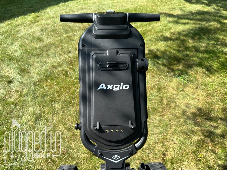 The battery can be charged separately or while installed on the cart. Removing the battery is done with the push of a button, and it slides back in just as easily. Per Axglo, the battery takes six hours to charge fully and should last for 36 holes.