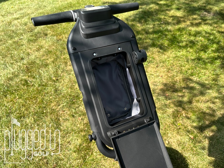 Inside the console is a single compartment. This is big enough for a dozen balls, a rangefinder, or your wallet, keys, and phone. It isn’t big enough for a large water bottle, but Axglo does include a beverage holder. The compartment lid is held shut with magnets, which is a really nice touch.