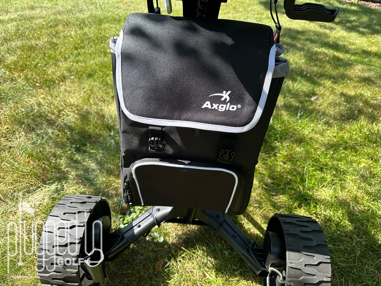 Axglo also has a range of other accessories you can add to your cart. Above, you can see their cooler bag. This is the biggest storage accessory I’ve ever seen on a push cart, allowing you to bring a load of drinks, snacks, or anything else you might want on the course. There’s also a seat and a storage bag for keeping your trunk free of grass and mud.