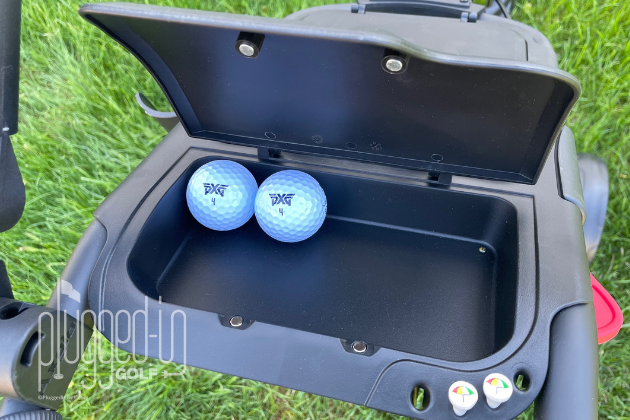 The storage on the Axglo Flip n’ Go Pro is simple yet effective. There are two separate areas for storage. Both are covered with magnetic hard tops. The larger and lower of the two is soft and has room enough for extra balls, snacks, and maybe even a light jacket or pullover (below). The upper compartment (above) is hard lined and shallow for essentials like a phone, wallet, or GPS. It also allows for a few balls but there’s not enough room for a phone and balls.