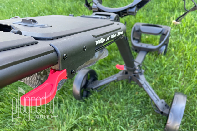 I have reviewed quite a few push carts from several brands, but the Axglo Flip n’ Go Pro might be my favorite for a variety of reasons. When I first got this to the course, I realized how nicely my bag sat on the cart. More specifically, the lower section is a unique wedge gap that fits the base of your bag – no matter what size or shape – without a strap. The top attachment adjusts up and down to fit your bag as well.