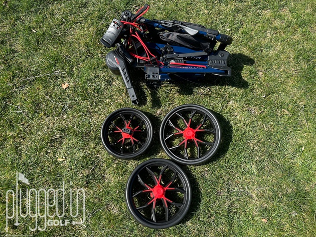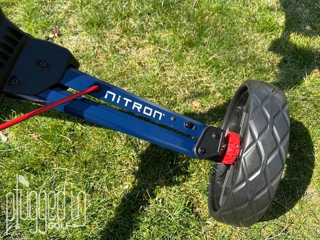 The wheels on the Bag Boy Nitron are hard plastic – 11″ in the rear and 9.5″ in the front. I prefer plastic wheels as they are zero maintenance. The Nitron rolls easily around the course, and the wheels are large enough to smooth out the normal bumps and divots you’ll encounter. If you find your cart drifting to one side, there is an adjustment available on the front wheel. This tuning requires the use of the included Allen wrench.