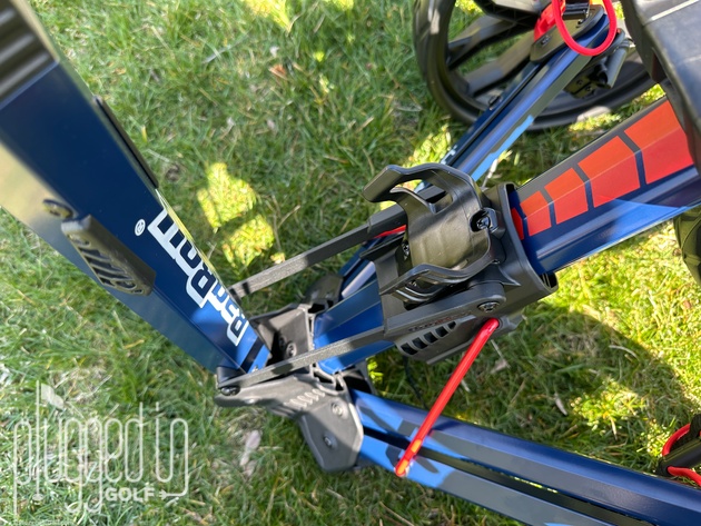 Let’s move on to the Nitron’s main selling point – “the fastest opening cart in golf.” If you look at the picture above, you’ll see a black plastic bracket just below the red graphics. This is what holds the cart in its folded position. When you pull the upper rail loose from the bracket, the Nitro Piston Technology unfolds the cart automatically.