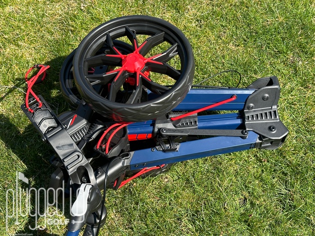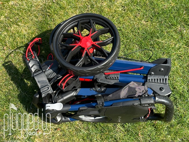 I will quibble with Bag Boy’s claim of “One Step Open.” As you can see above, the handle is not part of this automatic opening and closing mechanism. There’s a grey lever that needs to be pulled open to place the handle in your preferred position. That said, this is the fastest-opening push cart I’ve tested.