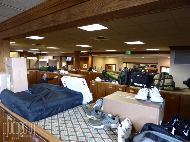 The locker room is the definition of organized chaos. Think back to high school and how tight the area was to change clothes. Now picture that same space (but with nice wooden lockers) crammed with golf bags, travel bags, those extra putters, shoes for every outfit, and giant tubs of gear. Sounds stressful but at the same time it’s peaceful away from the droves of spectators. Inside each player’s locker reps place a fresh stock of balls, hats, and gloves for the week. Staff distributes tournament and sponsor gifts in the lockers also.