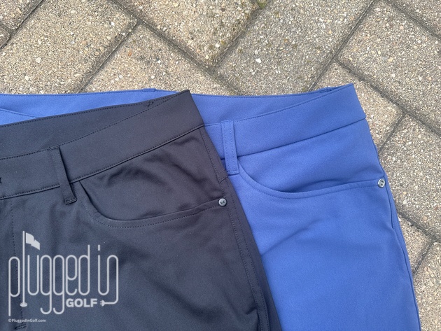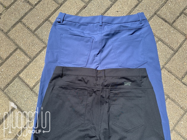 The two golf pants that we’re comparing for this first installment are the PXG Essential Golf Pants (black) and the Lululemon ABC Classic 5 Pocket Pant Warpstreme (blue).
