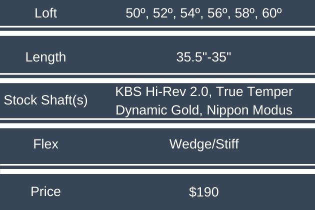 The Bettinardi HLX 3.0 wedge comes with four premium stock shaft choices. I tested these wedges with the KBS Hi-Rev 2.0. The other options are the Nippon Modus3 115 and the True Temper Dynamic Gold in S200 and S400.