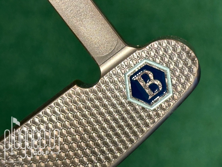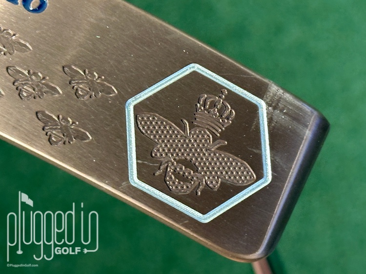 The rest of the putter shares its elevated aesthetics with the other 2025 Queen B models. The sole features a swarm of bees following the Queen B encased in a hexagon. This engraving is done with the high level of detail that we expect from Bettinardi. Also noteworthy is the Royal Rose PVD finish which pairs beautifully with the white and navy blue paintfill.