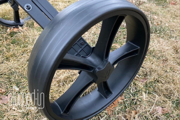 Most of the snow has melted here in the Northeast, so I was able to get the Big Max IQ 360 out on the course to evaluate its performance. The name of the cart (IQ 360) refers to the fully rotating front wheel which helps with tight turns. It also has a locking feature where you can prevent it from rotating. I could see myself locking it on a more hilly course when I didn’t want it spinning down a slope.