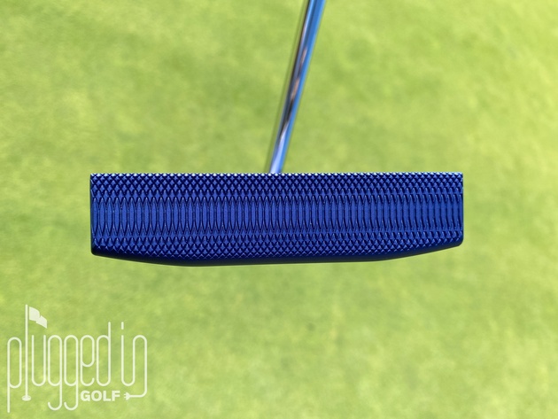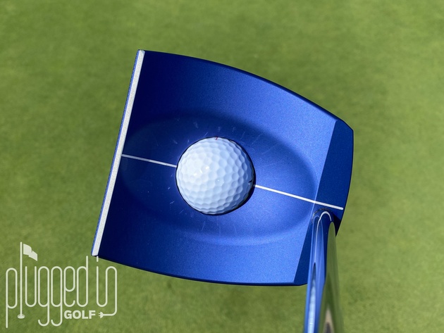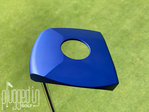 Do I need to state this obvious? This isn’t your granddad’s Bullseye. To start, the BioMech Acculock is big – approximately 4.5″ square. There’s also the color. The Acculock is available in black or silver, but when a putter looks this unusual, I think blue, pink, and burgundy are better options.