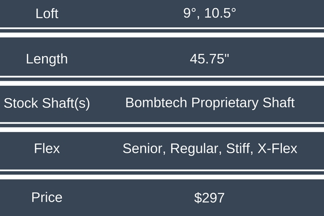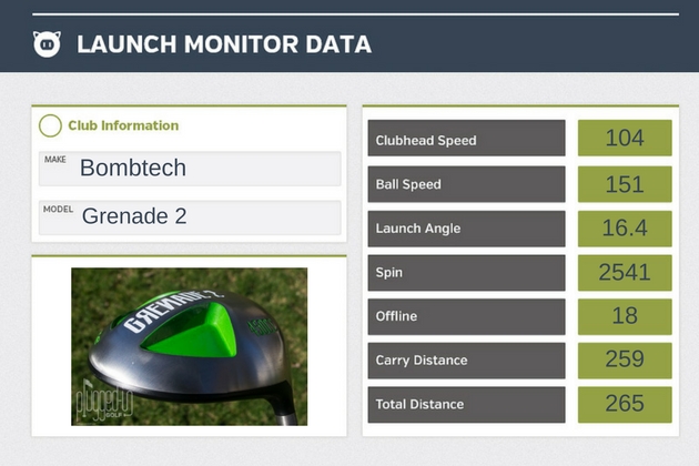 The Bombtech Grenade 2 driver claims to have superior aerodynamics for more club head speed. Stock shaft felt soft-to-flex. Very high spin numbers.