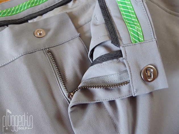The Highland Tour Golf Pants are again the category standout with numerous details that enhance performance beyond the 4-way stretch fabric with water repellent finish. The locking snap and gripper gel waistband shown above kept the pants secure and shirts in place. Embroidered eyelets for keeping your personal parts ventilated, plus “articulated back knee(s)” for unencumbered putt reading squats. For those of you that really appreciate details, I’d be remiss in not mentioning the fabric utilized on the back pockets that keeps your scorecard safe from sweat.