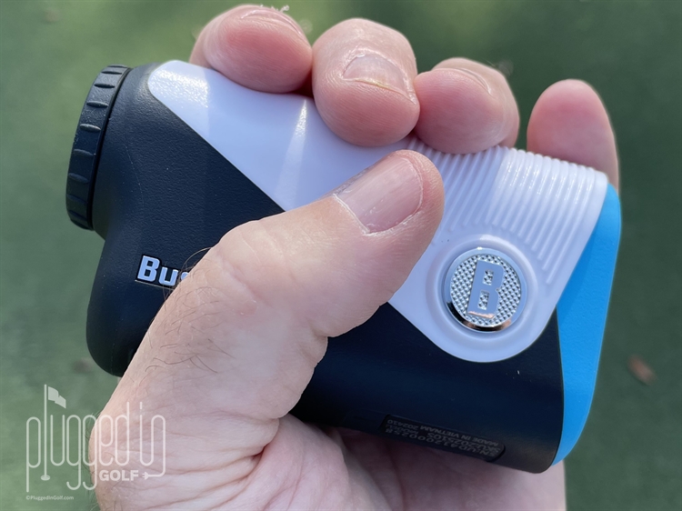 As you can see from the photo above, Bushnell provides everything you need to use the A1-Slope, including a charging cable and clamshell case. My unit was fully charged out of the box, enabling me to immediately test how intuitive the operation is – which I’ll describe as ‘very.’ Depressing the blue button on top of the rangefinder turns the unit on, while holding it down engages the ranging. The white button is for settings for the two options: yards or meters, and slope on or off. The Bushnell A1-Slope came set to yards with slope on, so most users may never need to touch the settings button – simple.