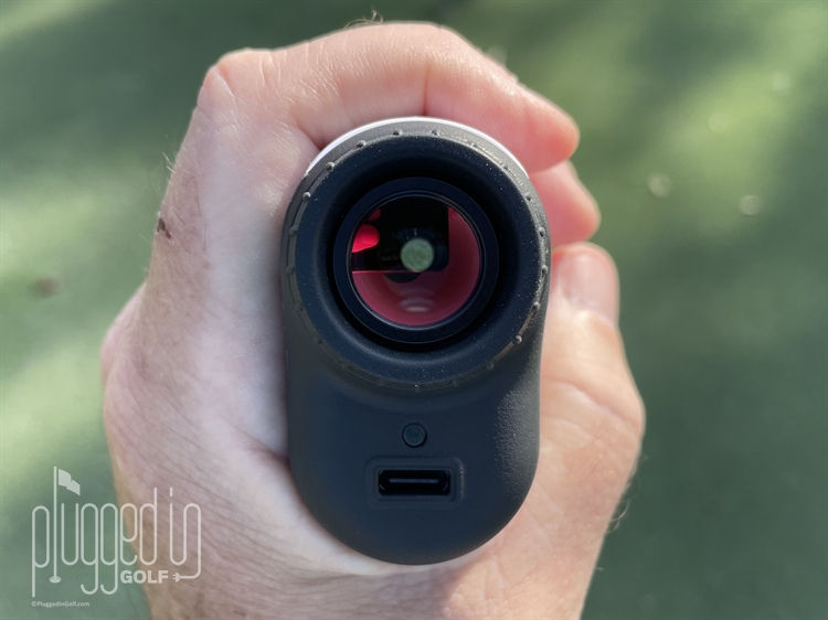 A few other technical specs are worth mentioning. First, the Bushnell A1-Slope has 6X magnification with a 1300 range – the same as say the Tour V6 Shift [full review HERE]. Where the A1-Slope comes up a bit short is on flag range: 350 verses 500 yards compared to the V6. Not a deal breaker, but something big hitters may want to consider. This final spec is really digging deep, but the A1-Slope exit pupil is 3mm. Think of exit pupil as the virtual aperture, or diameter, of visibility as you hold the rangefinder close to your eye. The smaller the exit pupil, the more precise your positioning needs to be. 3 mm (for reference the V6 is 4 mm) is perfectly usable, but if you sometimes struggle finding the numbers on rangefinders, I recommend trying the Bushnell A1-Slope before you buy.