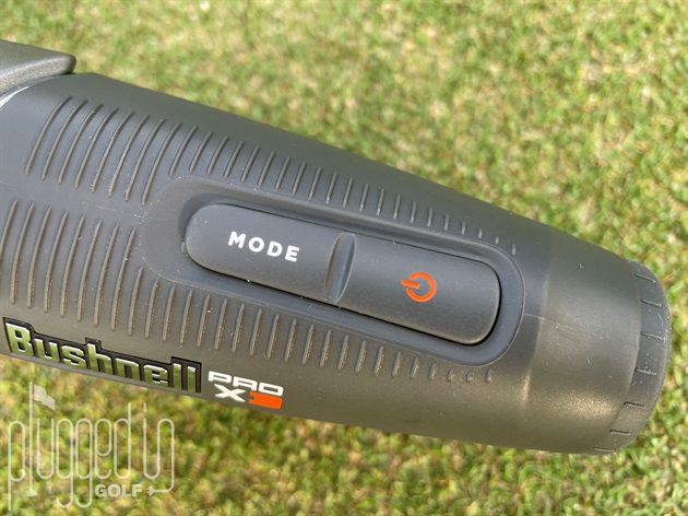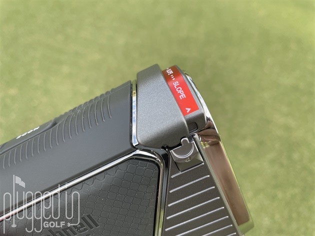 At the top front edge of the Pro X3 is Bushnell’s latest method of engaging slope. Importantly, it also allows everyone to see if it’s on or off. The small side latch and sliding hood have a substantial, industrial feel. The red band with “slope” stated three times makes it crystal clear that slope technology is active.