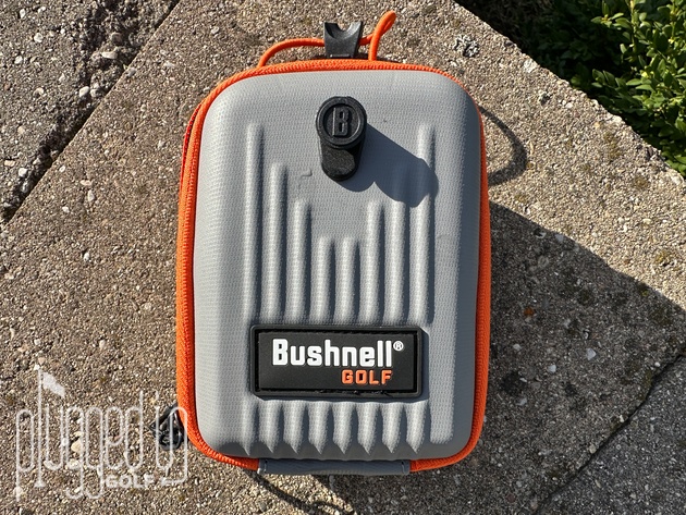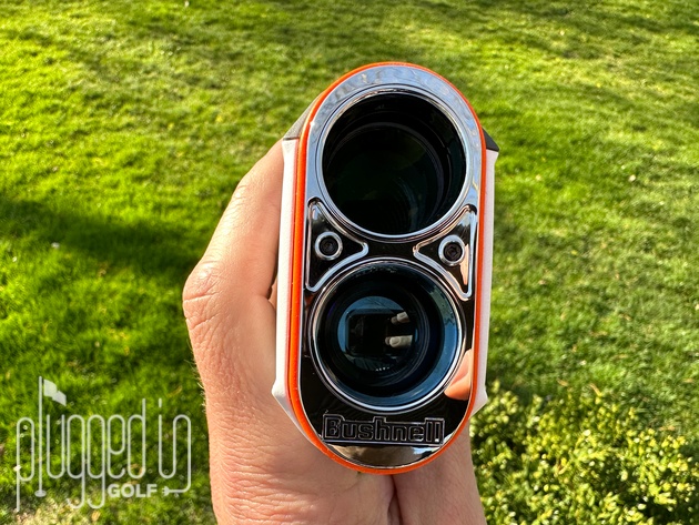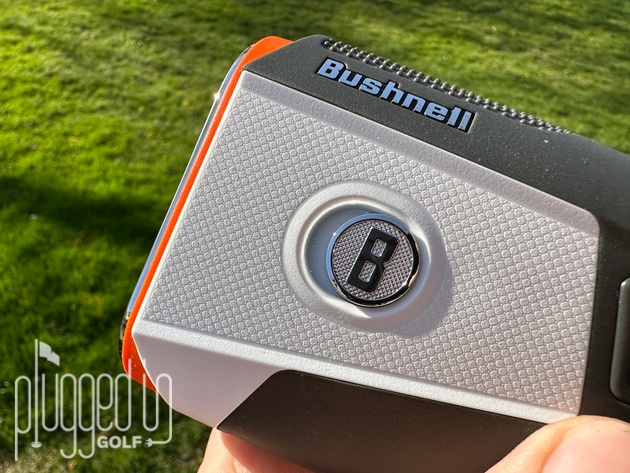 “Shift” in the name indicates that this is Bushnell’s slope-enhanced model. There is a standard Bushnell Tour V6 for players who don’t ever want slope-adjusted yardages. Switching the Tour V6 Shift from slope-adjusted to tournament-legal is as easy as sliding the “B” left or right. The photo above shows the unit in tournament-legal mode. Shifting the “B” to the left reveals an orange background and lets everyone know your rangefinder is adjusting for slope.