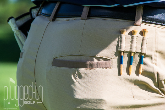 Caddy Slacks have six features designed for on-course performance: a magnet for your ball marker, elastics loops for your tees, a scorecard pocket, a glove holder, a cell phone pocket, and a ball pocket.  The ball marker magnet needs to be removed for washing and is too small, so that’s a miss for me.  The tee holster is solid, and the velcro for the glove is great.  The three pockets are a mixed bag.  I like all three of them, particularly the cell phone pocket because it keeps a large, heavy item out of the way.  However, I have set routines of which items go in which pockets.  Taking advantage of the Caddy Slacks required undoing some habits, but ultimately I found it worthwhile to have superior organization.