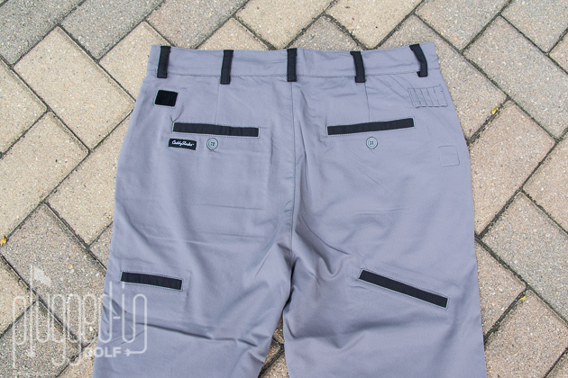 Caddy Slacks are available in four colors: khaki, brown, charcoal, and black.  The belt loops and lower rear pockets are trimmed in an accent color as you can see in the photos.  In the khaki/brown pairing, the accent is minimally noticeable, but it stands out in the black and charcoal.  I would have preferred that Caddy Slacks either got rid of the accents so that the pants are more wearable off the course, or go balls-out and make the accent colors bold.  As it is, the look is just a bit off.