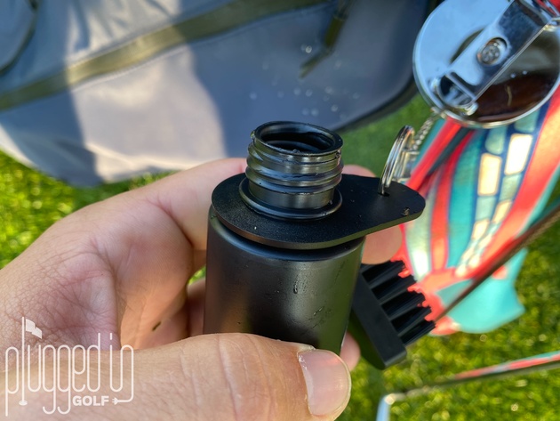 The Caddy Splash attaches to your bag with an included carabiner. A long, retractable chain allows you to use it comfortably – no bending over to clean your clubs or de-attaching and re-attaching the brush between shots. To get the water out of the handle, just give it a little squeeze, and it shoots out through the brush (below).