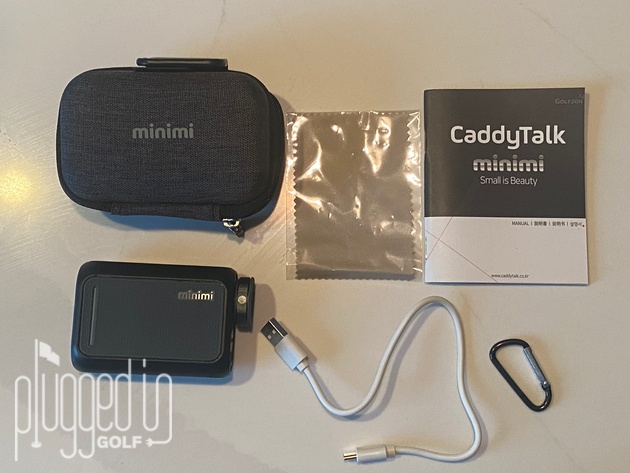 Unboxing the CaddyTalk Minimi NR Rangefinder reveals the laser, carrying case, USB cable, user manual, and a cleaning cloth.  My Minimi came with a healthy amount of charge on it, but it’s always a good idea to plug it in before you take it to the course.
