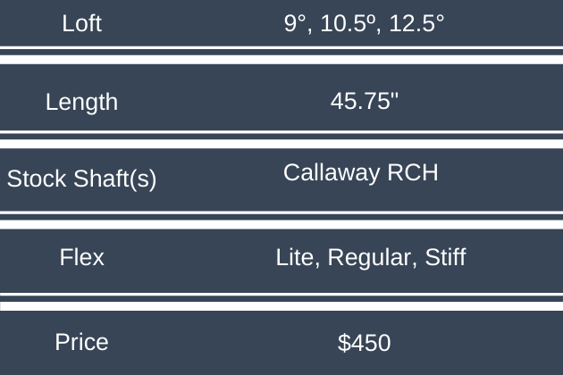 With the stock Callaway RCH 65 regular shaft, the club felt very balanced throughout the swing. At impact the head felt stable and invoked the word “POW” as if Batman had landed a punch as the ball left the tee. To my hands, feedback was marginal as would be expected from a large, forgiving face.