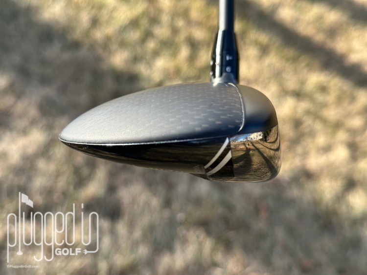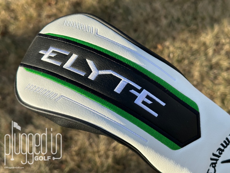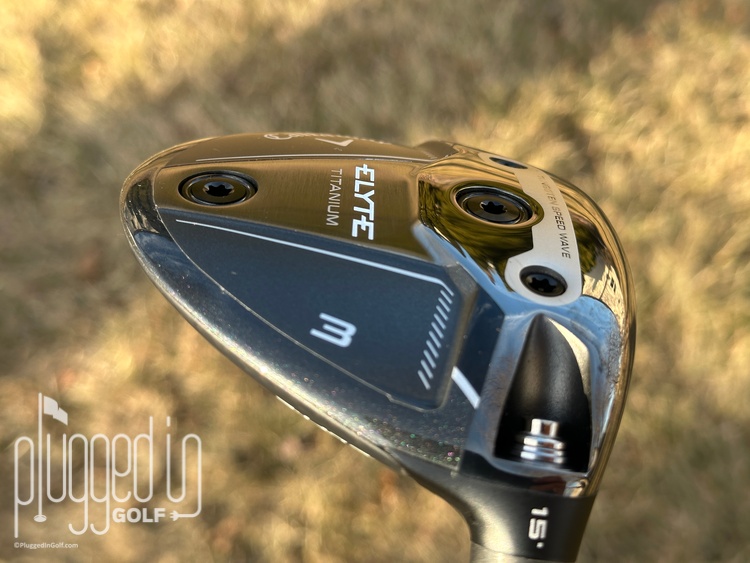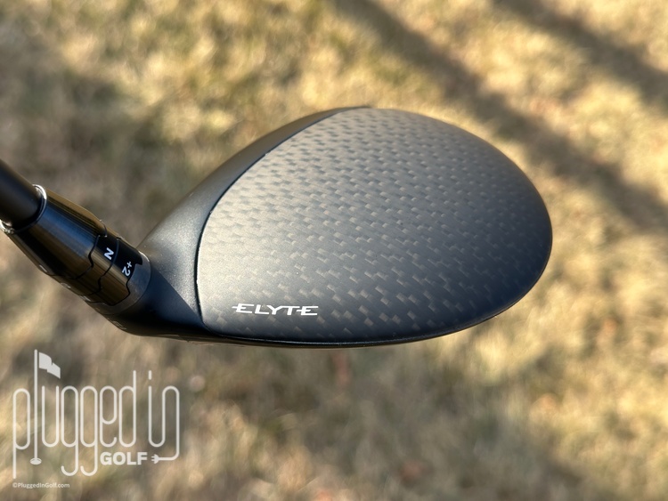 In the bag, the Callaway Elyte Titanium fairway wood has a look all its own. The sole is several shades of dark grey, and the slashes of green are notably absent. “Elyte Titaniun” is centered between the two, black movable weights. The Step Sole, while still noticeable, is less prominent for the way its finish carries into the back of the sole.