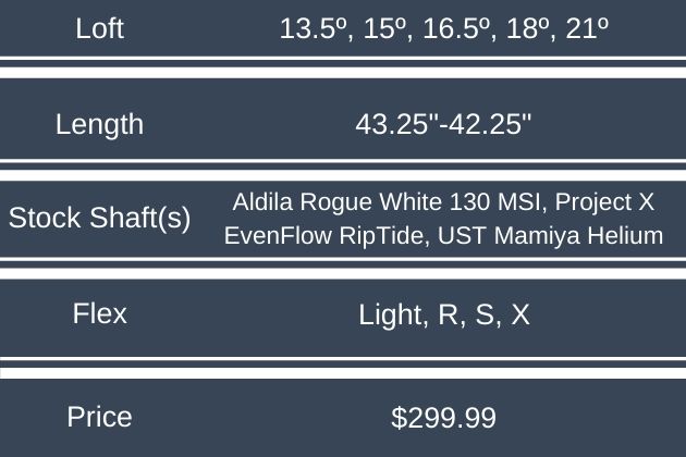 The Callaway MAVRIK fairway wood is technology driven, yet retains a traditional, albeit distinctive, look. Impressive ball speed and powerful distance. Slight draw bias.