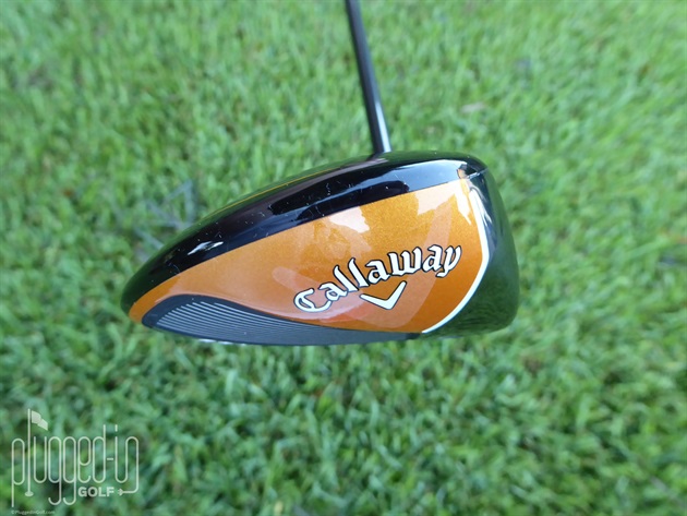 At address, the fairway is of typical size with an attractive round shape. Solid black at the front, the high gloss finish fades to clear, revealing the graphite weave construction of the crown. The chevron gave my eyes a focus point along with a subliminal message: “Please hit here.”