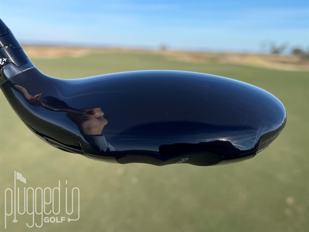 The Callaway Paradym hybrid has a lovely round silhouette that’s more akin to a small version of a fairway wood. The gloss black crown is adorned with a classic Callaway chevron that denotes the center of the strike zone. Face on, the hybrid has well balanced proportions that communicate “hit me out of the rough or off a tee – I’m good either way.”