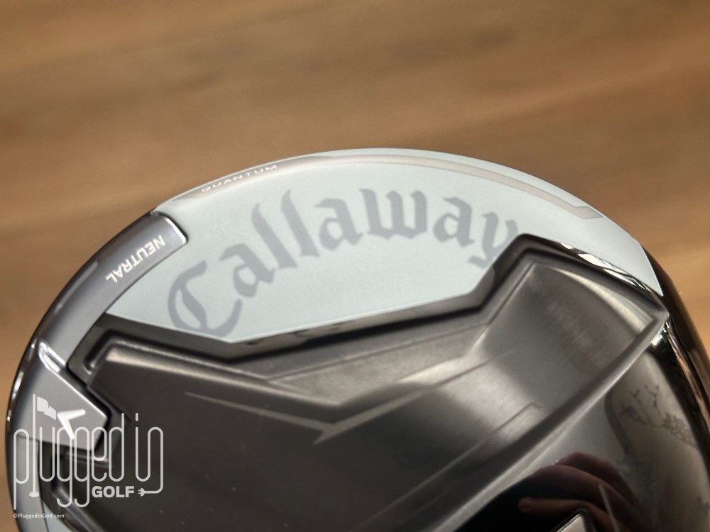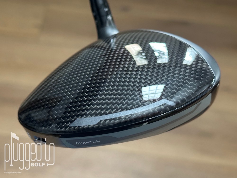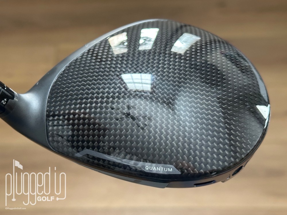 I’ll start by evaluating the Callaway Quantum Max driver, then I’ll offer some comparisons to the other models in the Quantum driver family. The Quantum Max driver has a shiny, dark grey carbon fiber crown with a thin ribbon of matte grey at the leading edge. A thin white chevron acts as a subtle alignment aid, and the other crown graphics are nearly invisible.
