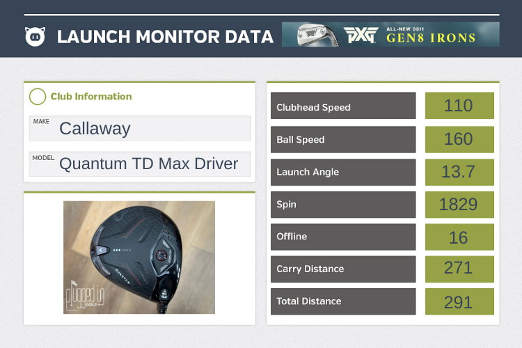 After I felt out the Callaway Quantum Triple Diamond Max driver, I put my back into the next swing, hit it dead flush, and felt my eyes pop open.  The feel on a pure strike is sensational.  It’s incredibly solid but lively in a unique way.  It doesn’t feel like a traditional thin metal face – because it isn’t.  On center, the sound livens up, too – a resonant “thwack” – though it doesn’t get much louder.  This is the kind of driver you’ll hit over and over, chasing that feeling of the perfect strike.