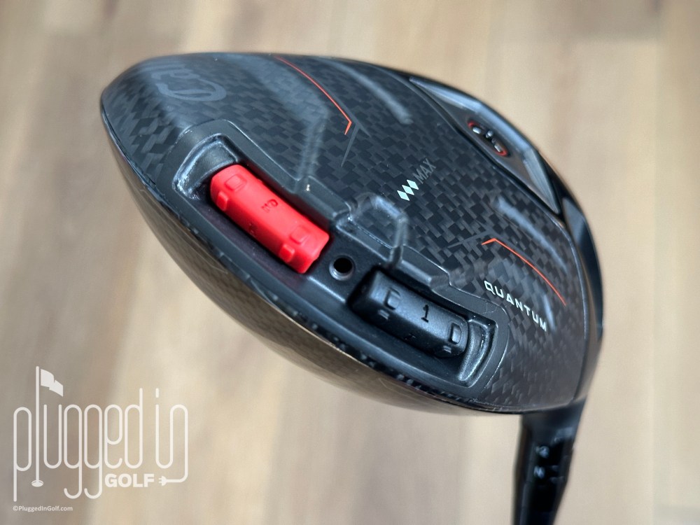 When you remove the cover, you see two weights (above).  In this case, they are one and nine grams, respectively.  Putting the heavier weight toward the toe creates a slight fade bias; putting it toward the heel makes it “neutral.”  To me, the difference was noticeable but not extreme.  During much of my testing I was hitting a lot of hooks.  Moving the weight toward the toe turned the hooks into playable draws and brought fades into the conversation.  If you need more help moving the ball left or right, the Callaway Quantum Triple Diamond Max driver also has an adjustable hosel.