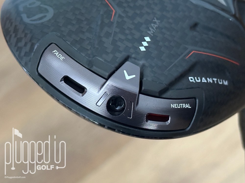 Comparing the Callaway Quantum Triple Diamond Max driver to the other Quantum drivers, Callaway rates the forgiveness as “Higher” which is in line with the Quantum Max and Quantum Max Fast.  The Quantum Max D has “Highest” forgiveness, the Quantum Triple Diamond merely “High.”  Both the Triple Diamond Max and Triple Diamond have Neutral and Fade settings; the Max has Neutral and Draw.  Finally, the Quantum Triple Diamond Max driver has “Lower” spin – between the Triple Diamond and Max – and “Mid” launch – the same as the Triple Diamond.